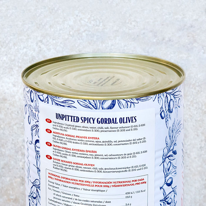 These whole gordal olives are unpitted and have a calibre of 70/80, so have the stone in – harder to eat but much more flavour – and have been dressed in a spicy marinade of chili and pepper, giving them that added punch.
