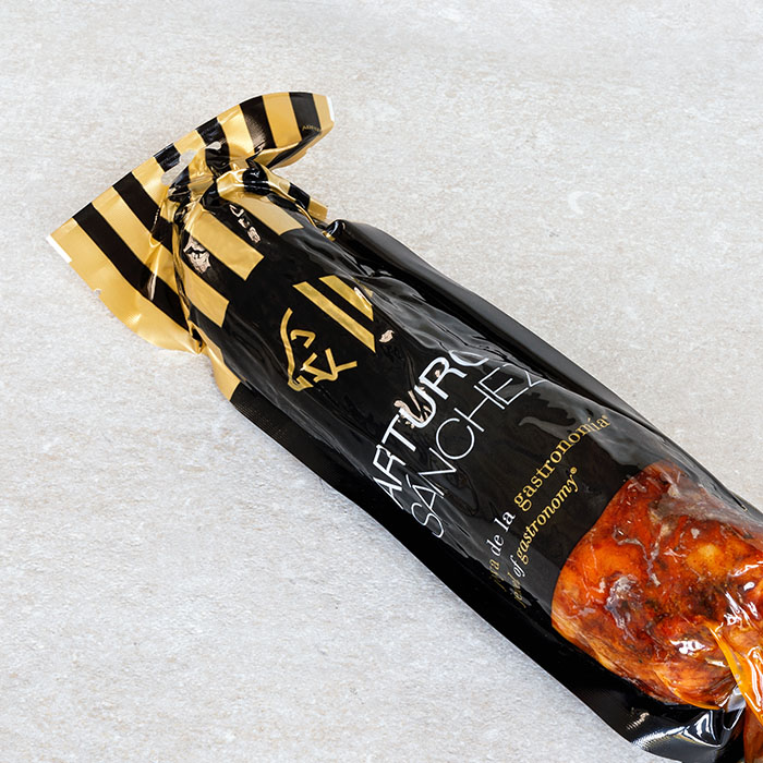 Arturo Sánchez’ Cabecero Ibérico de Bellota is one of a kind. Made from acorn-fed 100% Iberian pigs and cured for a minimum of 6 months in a natural curing process in the fresh mountain air of Guijuelo. Savour thin slices of this tasty, cured sausage with a glass of fine wine.