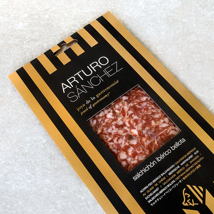To serve Arturo Sanchez Salchichón Ibérico de Bellota, open the pack and allow the sliced sausage to breathe for 30 minutes, just like a bottle good wine. Serve on a warm plate so the ham reaches the ideal serving temperature, and the oleic acid gets activated.