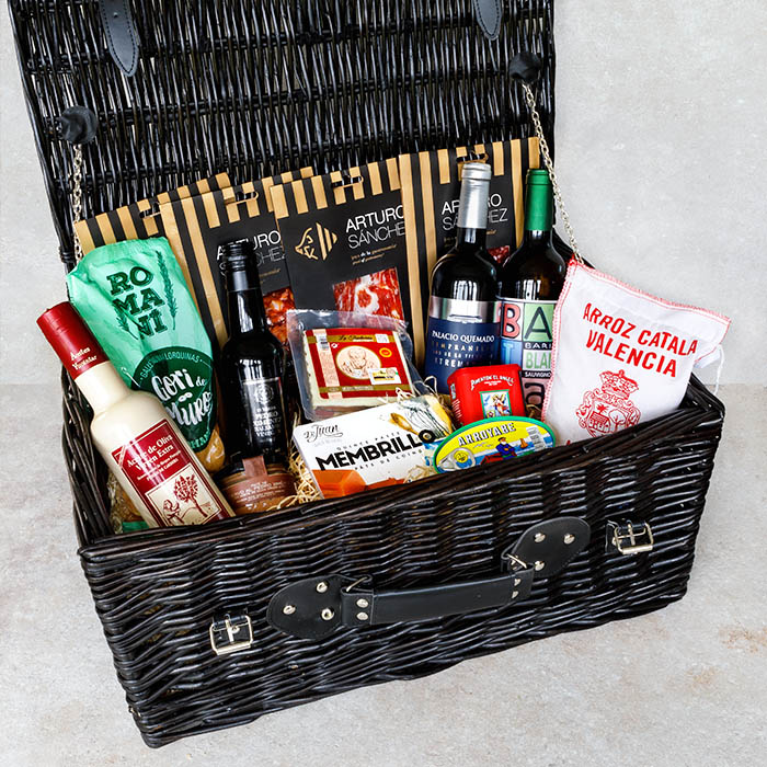This comprehensive selection of Spanish foods includes two bottles of Spanish wine, a selection of Iberico cured meats, our ready made paella kit and many more products! Our Spanish Gourmet hamper comes packed into a large black wooden basket, making it the ideal Christmas food gift. The hamper includes: