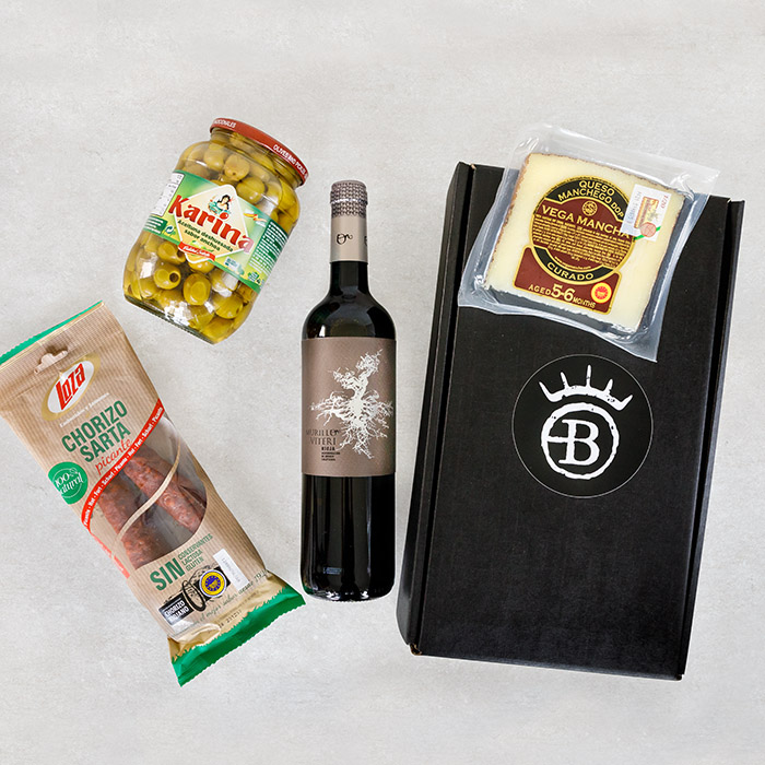 • Includes whole chorizo ring, manchego cheese, manzanilla olives and a bottle of Rioja