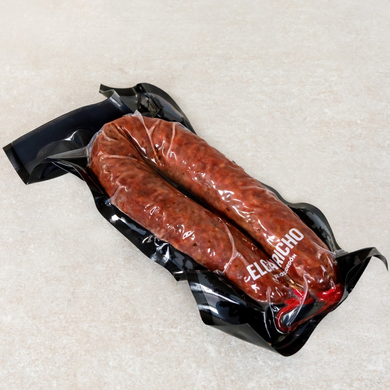 El Capricho ox chorizo is a fully dry-cured chorizo, ready to eat with your favorite cheese and wine, or just a chunk of crusty bread. No need for refrigeration.