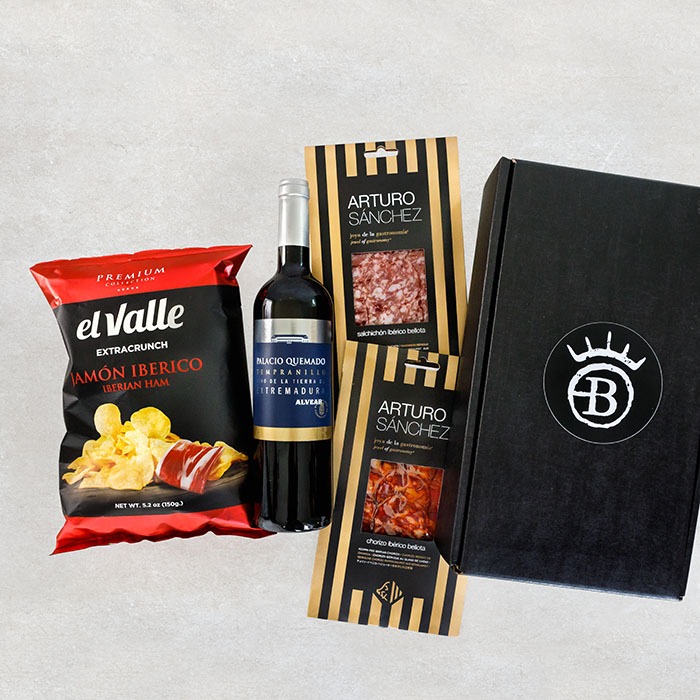 Includes sliced chorizo and salchichon iberico, jamon iberico crisps and a bottle of Extremadura red wine