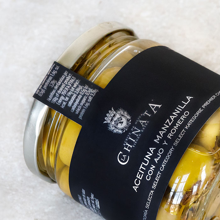 La Chinata Manzanilla Olives with Garlic and Rosemary 350g