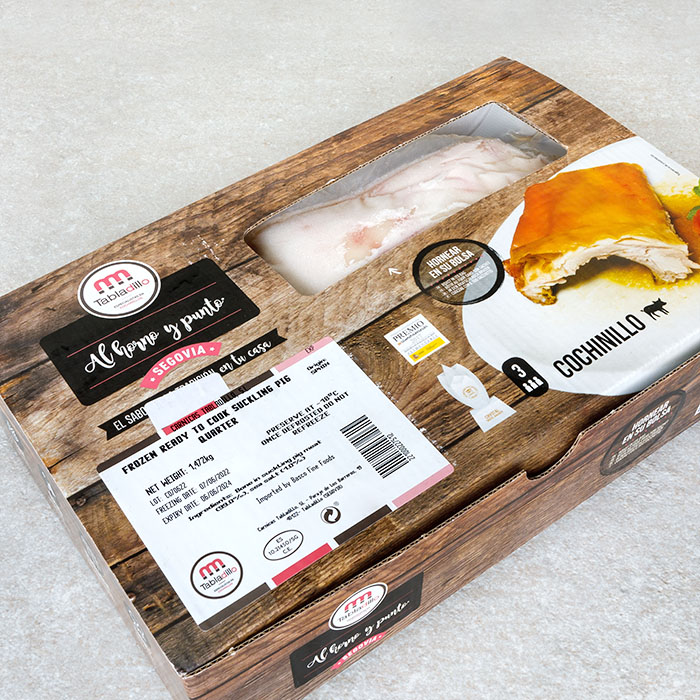 Our ready to cook suckling pig quarter is a convenience solution, consisting of a traditional quarter of Spanish cochinillo from Segovia, that you can cook in just 2 hours inside a thermoresistant plastic bag, preserving all the properties, flavour, freshness, juiciness and avoiding the hassle of preparing and knowing how to cook a suckling pig, plus there is no oven cleaning afterwards!