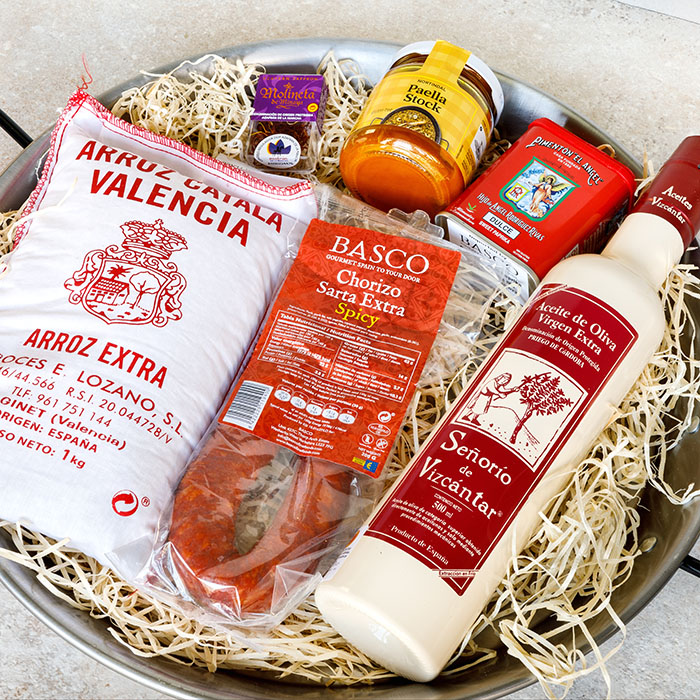 The set includes an authentic Vaello La Valenciana polished steel paella pan measuring 38cm in a diameter, a bottle of our single pressed extra virgin olive oil from Cordoba, a beautiful cloth sack of paella rice 1kg from Valencia, a ring of La Gloria Riojana Chorizo Picanta Sarta 230g, a jar of ready made paella stock, a can of smoked paprika from Extremadura and a plastic box containing 0.5g of authentic saffron from La Mancha.