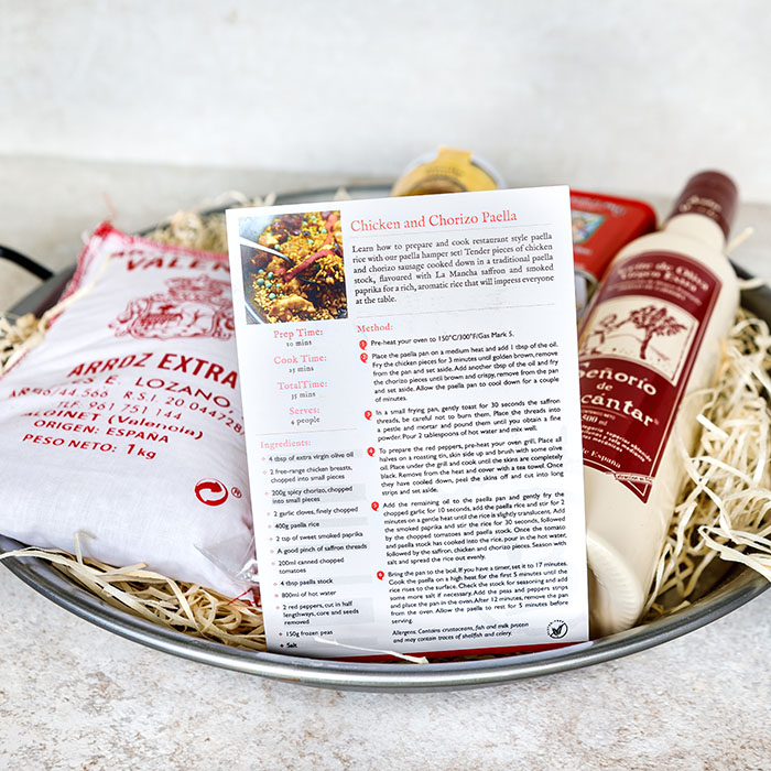 The paella hamper set includes everything you need to prepare a fresh paella from scratch that is perfect for 4 people to share. Tender pieces of chicken and chorizo sausage cooked down in a traditional paella stock, flavoured with La Mancha saffron and smoked paprika for a rich, aromatic rice that will impress everyone at the table.