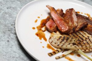 Pluma Iberica is a rather special cut taken from the neck end of the Iberico pork loin. In Spanish, pluma translates to ‘feather’ – due in part to the point-like shape – and is sourced from free-range Iberian Black Pigs. Pluma does have rather an abundance of fat that covers the lean meat underneath. However, it is precisely this fat that makes pluma so tasty and succulent. You need to cook it like a steak, charred on the outside and medium rare in the middle, with a good sprinkle of crunchy salt flakes at the end. Parsley, garlic, and lemon make up a classic gremolata, but I like to add some olive oil to make it more into a sauce that I can spoon over grilled meats. Some chopped hazelnuts give the gremolata a nutty texture that pairs well with the acorn-fed pluma Iberica.