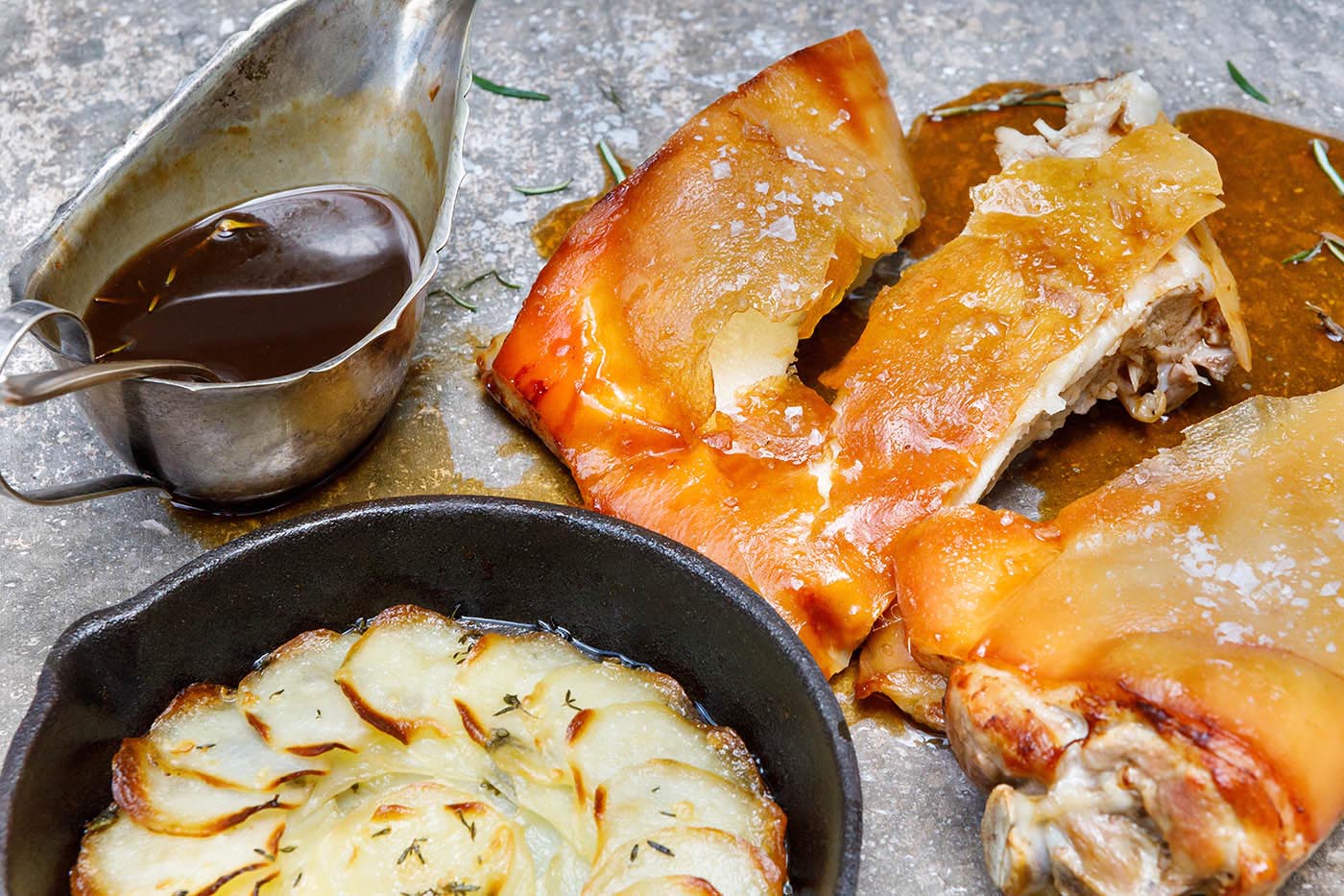 This recipe is very easy to make, and the result is a very crispy suckling pig rack perfect for two people to share over a glass or two of wine. I like to serve my suckling pig rack with some pommes anna, a classic French dish of sliced, layered potatoes cooked in melted butter.