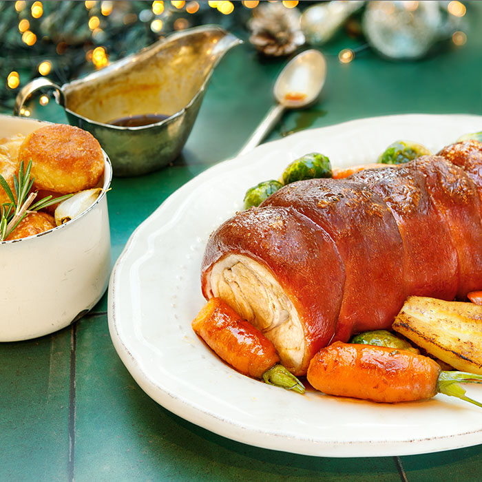 This recipe is very easy to make and the result is a very tasty Sunday roast dinner or alternative Christmas main course. The boneless suckling pig is made from a joint of rolled loin and belly, ready to roast. The belly provides flavour to the loin, by basting it with its fat content, keeping the meat moist. I tend to keep this dish very simple when serving it. I like it with some roasted potatoes, caramelised carrots, some greens and a Yorkshire pudding! The secret to a perfect crispy crackling is to start and finish the cooking process on a high heat so that the skin starts to crisp up quicker and finishes the same way. Be careful not to cook the suckling pig on a high heat or it will dry.