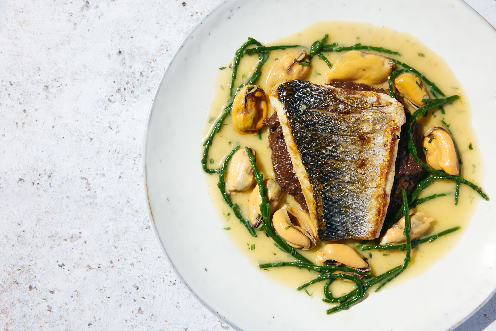 A proper surf and turf of earthy ox morcilla and pan fried sea bass served with sherry pickled mussels, samphire and a beurre blanc made from the mussel cooking juices.