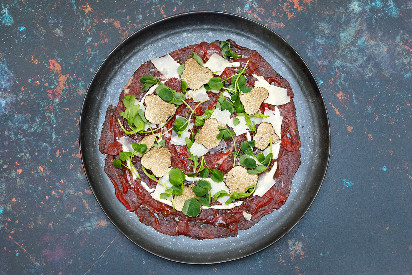 A delicious beef carpaccio recipe made from txuleta sirloin steak that has been frozen before slicing very thinly and served with black summer truffle, shavings of aged Zamorano cheese and a drizzle of truffle mayonnaise. The beef can be sliced in advance leaving you to dress the plate before serving your guests.