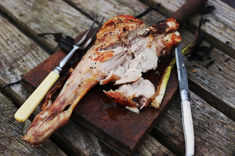 As you probably know, I love cooking in wood fired ovens, there’s something seriously intense about the heat from cooking near direct flame, and lamb works so well, I was recently sent a sample of a milk fed leg of lamb from Spain, from importer Basco Fine Foods and when it arrived, it really was a tiny leg of lamb, and very delicate looking, milk fed lambs are still not weaned from their mothers, and a real delicacy…yes I did feel a little pang of guilt as I watched the lambs prancing around the local fields…but I wanted to try this delicacy. The milk fed lamb was so sweet and had a lovely slight gaminess, was tender and juicy to eat, a real revelation, and unlike any lamb I had tried before, it worked really well with the sweet roasted veg… and my new favourite beer a honey and rosemary ale from Spain called La Socarrada which was perfect with a slight sweetness and citrus acidity.