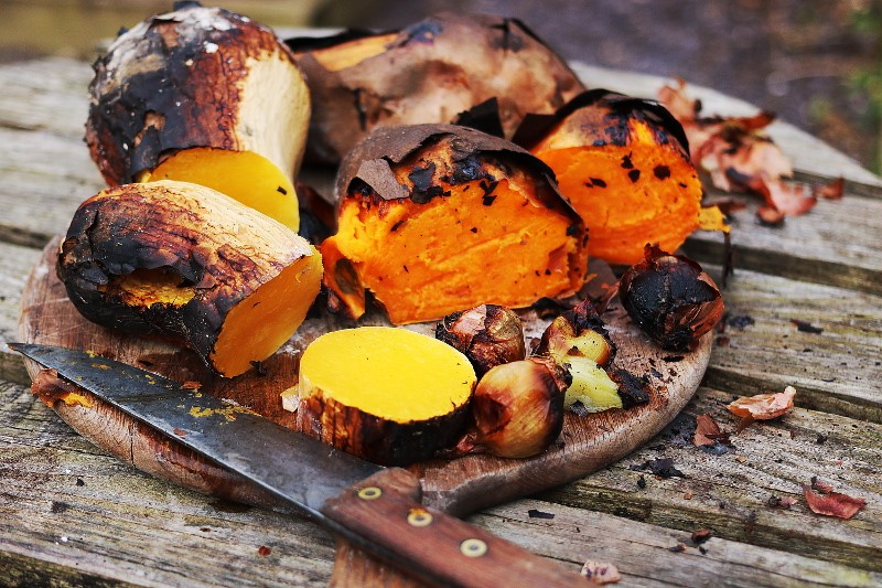 4. I had also popped some veg in the wood fired oven, a butternut squash, a couple of sweet potatoes, and some shallots, to cook for around an hour, until soft inside, I used a knife to test.