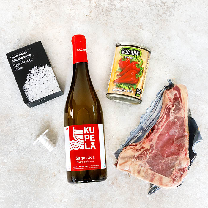 Our steak hamper includes a whole rib of Galician beef, masterfully paired with our Basque Añana salt flakes so you can season the steak well, a tin of wood roasted piquillo peppers from Navarra ready to confit in some olive oil and garlic and a bottle of Kupela Basque cider and a cider pourer, so you can break the cider in style and do your own txotx.